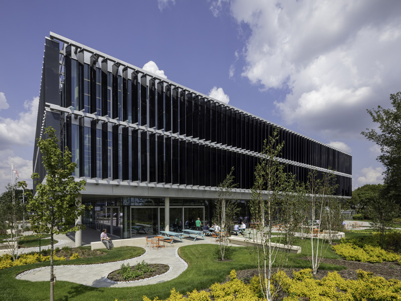The building was designed to be both low energy in use and sustainable in nature by adopting an approach based on the principles of Passivhaus. It incorporates a variety of environmental credentials, including exposed thermal mass, super insulation, good airtightness, maximum daylight with external shading to control solar gain, displacement ventilation providing high volumes of fresh air at low velocity, the openable windows, a rooftop PV array, rainwater harvesting, and EV charging points. Staff wellbeing was incorporated into the office design through controlled natural light with outside views from every desk, and a displacement ventilation system that provides access to fresh air. Fitness classes are run in a large conference room, and well-landscaped external spaces were designed for employees to gain access to fresh air and daylight. The focus on employees and their health and wellbeing led the design of every aspect of the building.