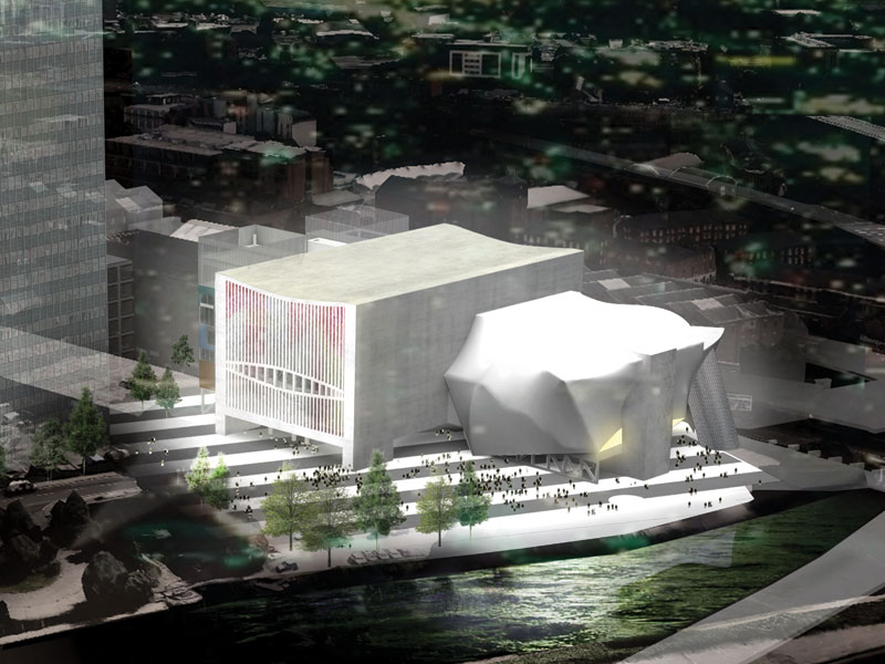 The initial inspiration for the design was that performance spaces need to be designed for maximum freedom. The idea was to actually create a large space that is completely multifunctional and you could say almost oversized, so you can do anything with it. When visiting the building you can experience a totally contemporary piece of music, art or performance, but at the same time you can also take in a more classical theatre experience — that’s why the design is a big box, in combination with a more traditional theatre shape. By combining the two volumes you can make very large pieces with dramatic stage performances, where the big box is the whole stage and back stage for the theatre.