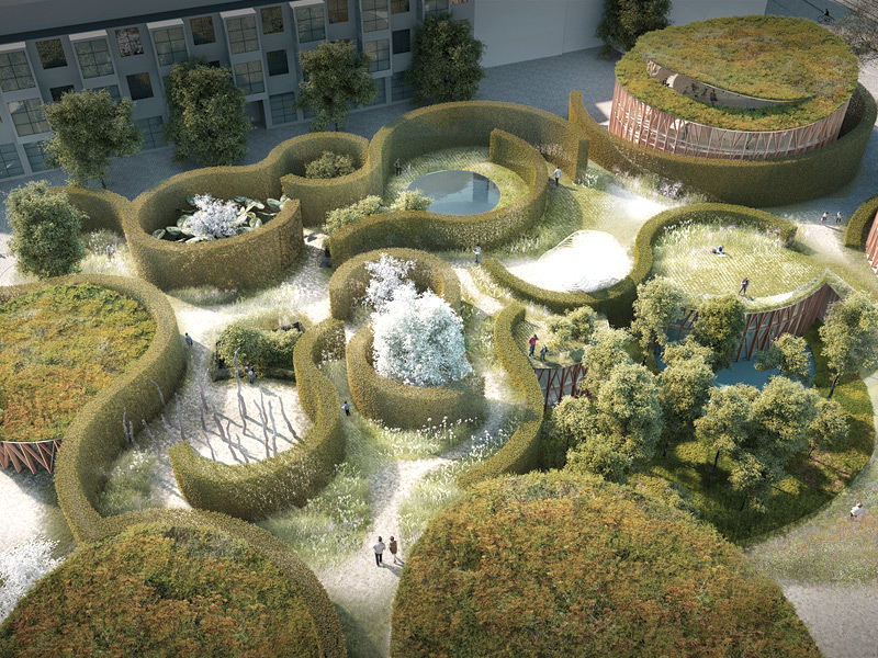 Green hedges create ambiguous, mysterious spaces for the visitor