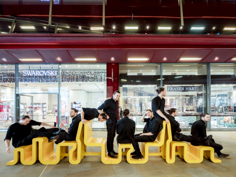 McMu’s first realised public project in London was installed for the London Festival of Architecture in 2018. The bright yellow undulating bench, providing perches for single people and groups alike, is over 5m long and was completed on a very tight budget. There were aspirations to expand the project, imagining it at an infrastructural scale: a furniture system ‘winding its way around the city centre’.