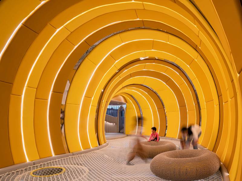 Situated in Shenzhen Nanshan Park, its Forkids project utilises the double height space with mezzanine levels to create vertical extension and spatial excitement for kid’s selfexploration. The design scheme uses curves to break the rigidity of the building periphery boundary and seamlessly connect all activity zones situated at the three different levels. The overall design language fills this imaginative landscape with colour, shape, scale and tactility which fulfil functional and emotional requirements of a play-scape and give memorable experience for kids and adults alike.