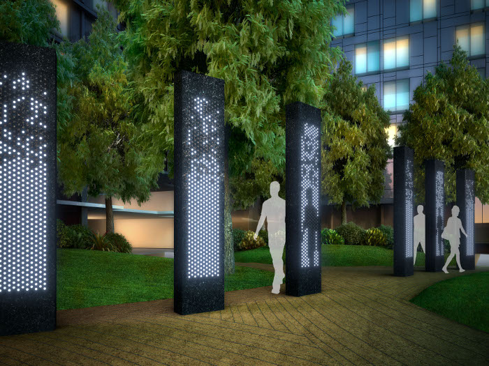 The work will consist of an array of monolithic granite structures that sense changing levels of light and dynamic movements from people and trees in the park in real-time, and represent them via artwork one through the granite as animated silhouettes on the opposite side. The images on the 3m x 60cm x 20cm monoliths are revealed by controlling an array of LED lights, diffused by glass lenses embedded in the stone.