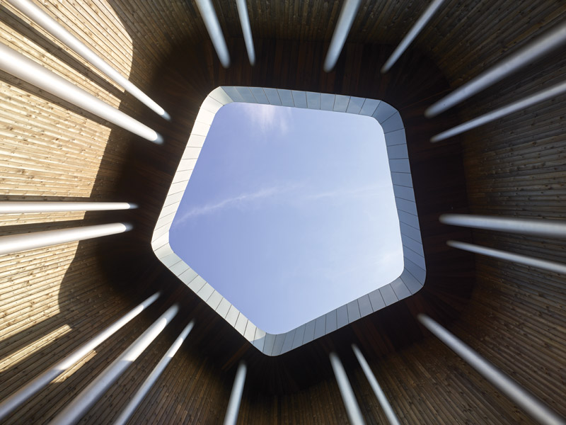 This sense of play is most evident from the tower, as you look down onto the zinc roof with the pattern of pentagons clearly visible. For this reason, the architects say that the helical tower ‘expresses the secret of the building’.