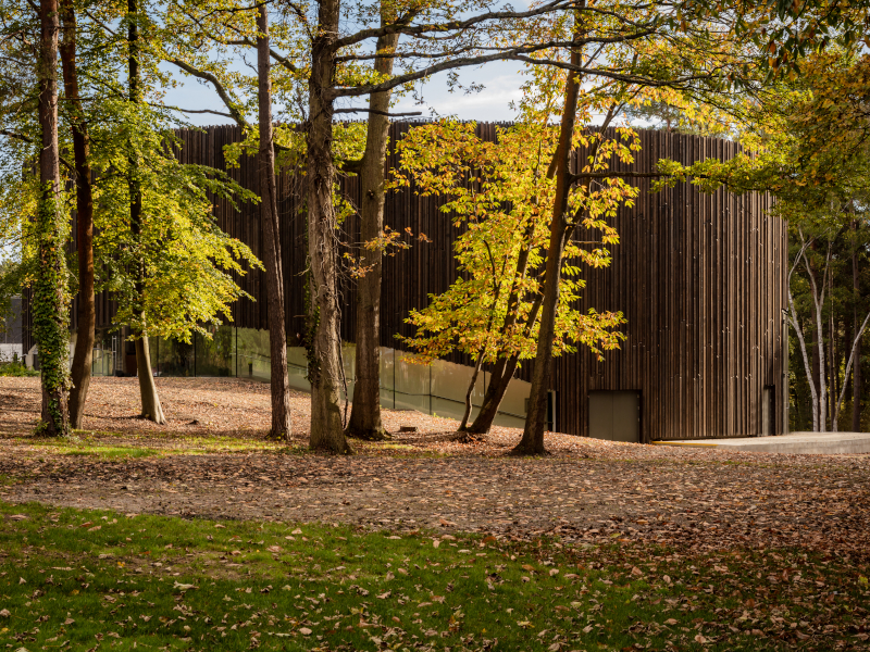 Set against the backdrop of old woodland and in front of the historic Victorian buildings of Wellington College, the GW Annenberg Performing Arts Centre’s circular shape and stained timber facade make it a thing of nature – a thing slightly apart from academia – where the school’s art, life and performance culture can evolve and thrive.