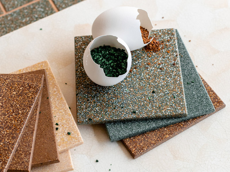 The idea of walking on eggshells could soon have a much more positive vibe, as ethical design brand Nature Squared has perfected a low-energy method of turning food industry waste into beautiful floor and wall tiles. Its CArrelé wall and floor tiles are made from a composite of crushed eggshells, cured at room temperature to form an ecofriendly tile that actually absorbs carbon dioxide. CArrelé comes in a variety of square, rectangular and triangular shapes and in three colour families.