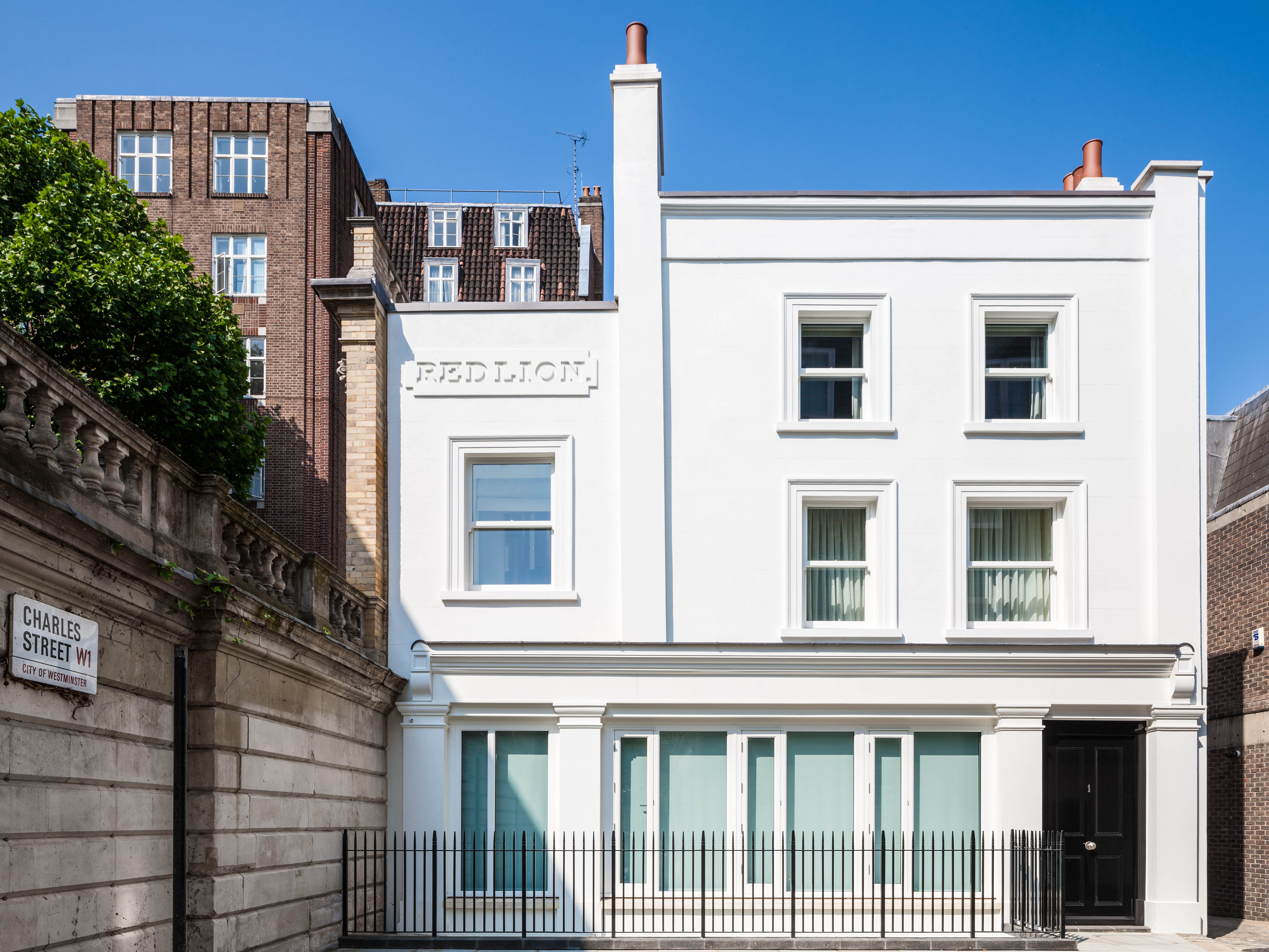 The pub facade faces east, and its stucco has been repainted dazzling white, including the Red Lion inscription. But every side of the Mayfair house is different. The north side of handmade brick hosts a surprisingly discrete entrance from a narrow cobbled mews. Bringing light into the ground floor was a challenge because the site is bounded to the south by a light-blocking listed Georgian wall of blanked arches, balustrades and a pediment, partially shared with the Sultan of Brunei's Chesterfield House. A cour anglais, the architectural device that brings light into Victorian streetside basements, is situated between this wall and the house, and not only brightens the reception room but the generous double-height dining room sunk into a lower floor. Below this are two more subterranean levels, hosting facilities like a gymn, spa and 12.5m-long swimming pool. The plant rooms down there seem worthy of an office block, but it's all tucked away and acoustically shielded.