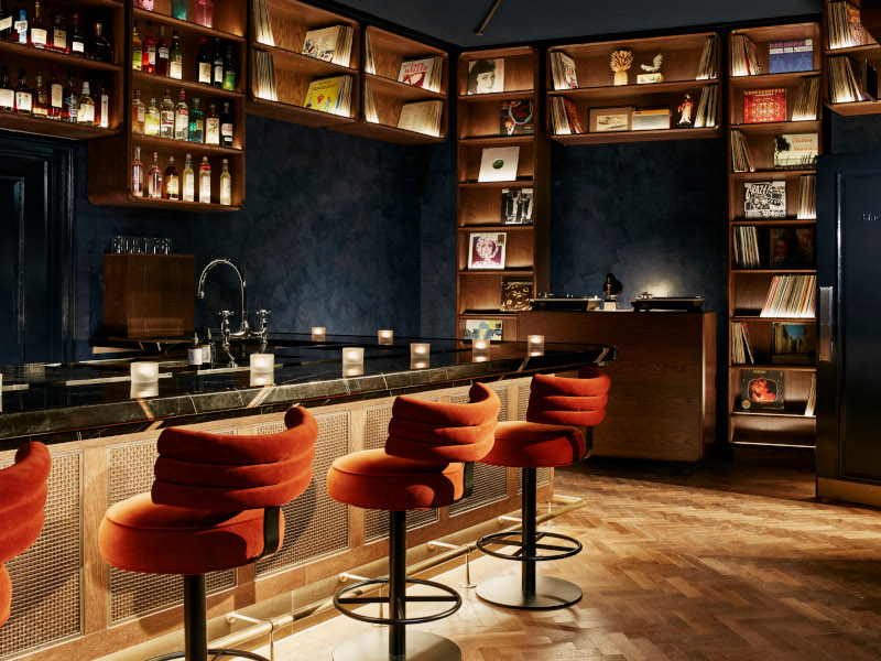 A subterranean cocktail bar, Black Lacquer, draws its inspiration in concept and name from vinyl records. The refined Japanese aesthetic of this space is informed by Tokyo’s music cultural scene with its famous ‘listening bars’. Here, its moody and intimate feel is achieved through dark upholstery and midnight blue wall finishes. Design details include polished plaster walls with grooves inspired by the music patterns on vinyl records, and the single-level bar enhances the connection between mixologist and guest, providing a sense of theatre to the art of cocktail making. The space includes three alcoves for intimate conversations, lit only by candlelight. Bespoke design is in abundance, from the curvilinear burnt orange bar stools to the high-level shelving that houses the vinyl record collection, wrapping the perimeter of the room.