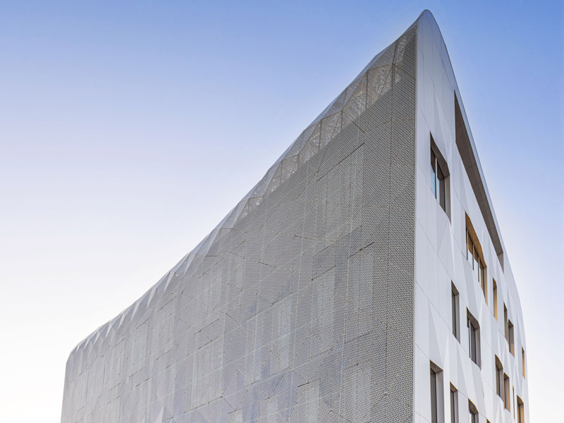 Wave 1 is the first of a series of healthcare buildings making up The European Center for Families in Sopot, Poland. Inspired by photography of waves at sea by Pierre Carreau, the building has a finely detailed façade of perforated aluminium panels on two sides and sintered ceramic on the other faces.
