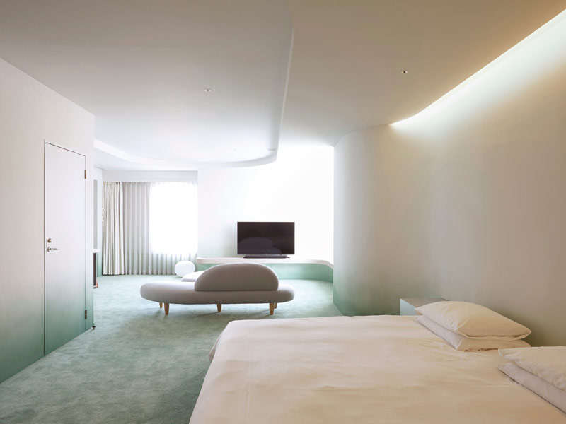For the fourth-floor room, which features a large window overlooking the city where morning sunlight streams in, the aim of the effect was early morning light shrouded in mist. A green carpet is designed to be reminiscent of a grassy plain. Where it joins the walls, the vertical surface has been painted in a gradation of green to white, evoking the image of being in the middle of a misty field.