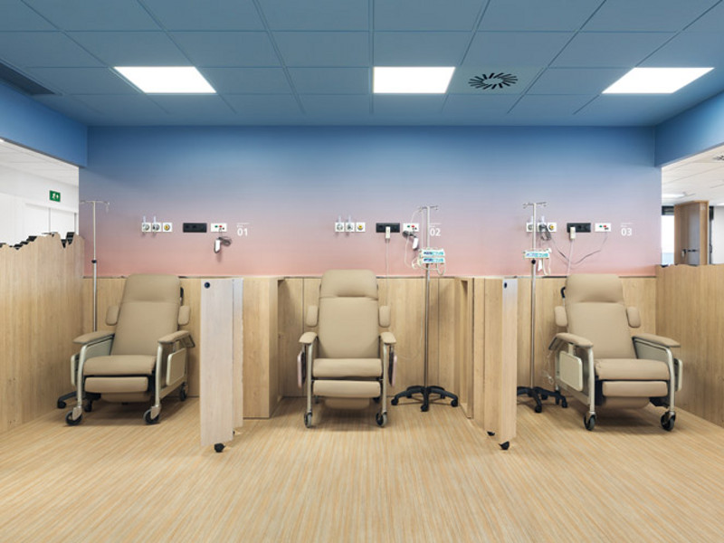 While their designs in these children’s units are full of bright patterns, stunning interactive machines and colourful 3D depictions of animals through layered fins or rods, this project, for an oncology and dialysis unit serving Spain’s central Catalonia region, takes a different approach, while understanding that, essentially, adults need the clinical, intimidating and technology-heavy hospital environment to be humanised too.