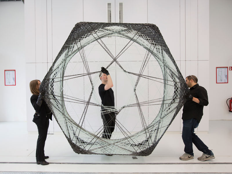 Also, an installation by architects and engineers at the University of Stuttgart – the Elytra Filament Pavilion (above) – explores the impact of emerging robotic technologies on architectural design, engineering and making. Inspired by a lightweight construction principle found in nature, specifically the fibrous structures of the forewing shells of the flying elytra beetle, the pavilion in the V&A’s courtyard comprises an undulating canopy of tightly woven carbon fibre cells created using a novel robotic production process.
