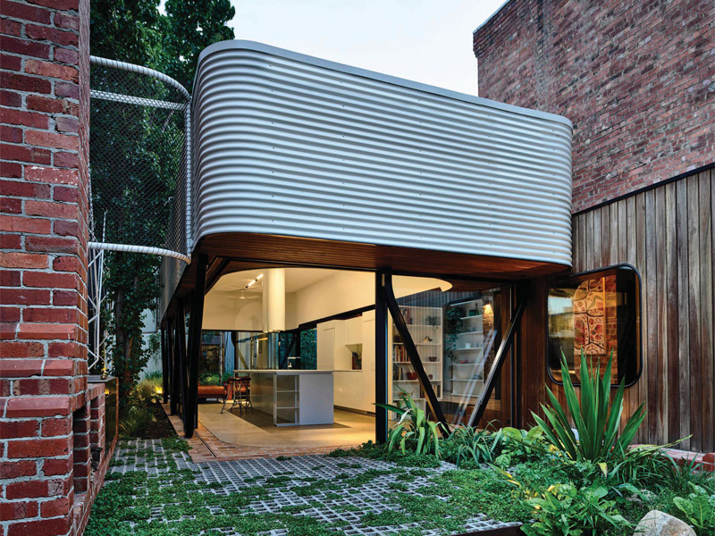 A bold and playful rethink of a family home in Melbourne, complete with corrugated metal cladding and a sinuous glazed bridge, creates a pocket of joy for its owners — and neighbourhood