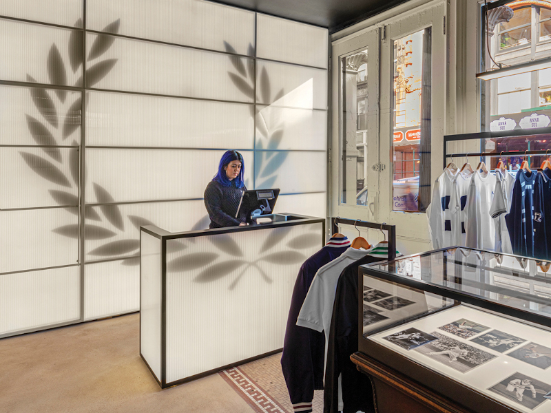 The store expresses Fred Perry’s renowned British style and features a contrasting palette of materials including matt-black steel and reclaimed wooden cabinetry. An exposed brickwork feature wall has been fitted with clothing rails and bespoke units to display the brand’s collections, collaborations and its archival gallery. A backlit polycarbonate wall, with the brand’s signature laurel wreath, works to separate the open-plan shop floor from back-of-house functions and complements the long, narrow floor plan of the townhouse building.