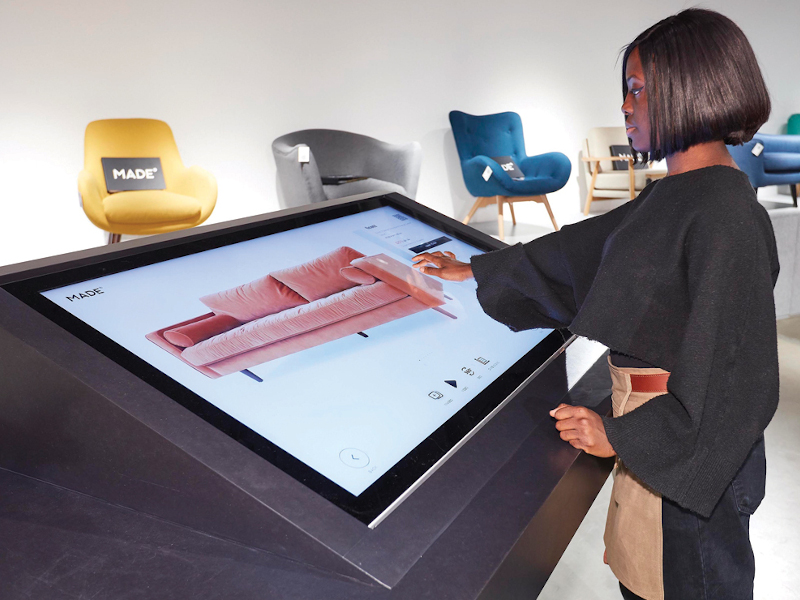 The design of the central London location’s non-digital aspects reflects the compartmentalisation of online shopping. For example, the fabric samples are neatly stored in a cupboard in the far corner of the store, which consumers can effectively ‘click open to peruse the options available before shutting them away again. Even the two large touchscreens that stand in the central aisles of the London store provide customers with an opportunity to tap for help and call a member of staff for assistance. Bennett says Made’s showroom team monitor how people are interacting with the screens, and they will then use instant messaging platforms to communicate with one another, ensuring customers are approached by the most suitable staff member.