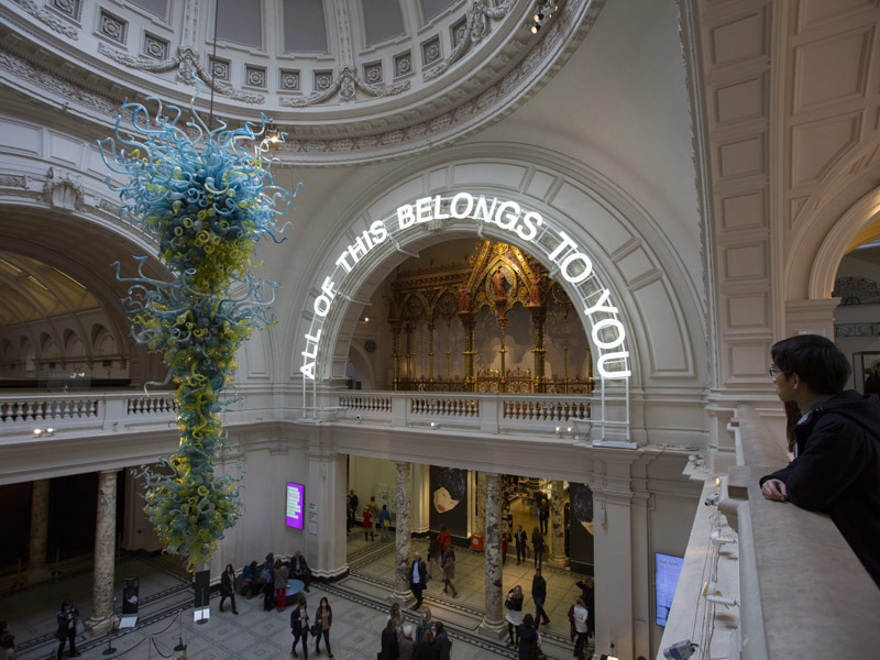 The museum's current exhibition, All of This Belongs to You, takes a similarly radical, self-appraising stance, engaging the long narratives around its historic as well as its recent 'rapid response' acquisitions. The exhibition is spread around the museum; as well as four specially commissioned pieces and displays, a range of 'civic objects' have been selected from the V&A's permanent collection. The dispersed exhibition and accompanying events examine the museum's role as a public entity, providing not only the possibility of appreciating interesting objects, but an chance to interrogate the subject of 'publicness'.
