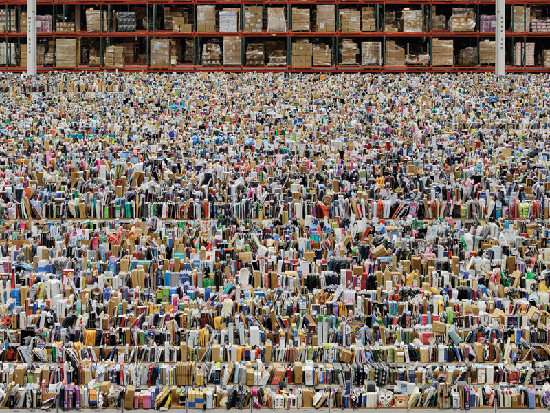Of course, Gursky’s work is not simply all about visual effect: through the subjects he photographs, the artist explores the social, environmental and cultural issues of our time, from mass consumption to the evolution of technology. In Nha Trang (2004), we see dozens of women in a Vietnamese factory making furniture for Ikea; in Amazon (2016), a vast warehouse is photographed containing what appears like a sea of packages ready to be delivered to the thousands of e-shoppers who bought them. Meanwhile, in the outside and equally problematic world, Ohne Titel XIII (2002) depicts a landscape of pure rubbish — the large-scale rubbish dump in Chimalhuacán, Mexico City — while in Les Mées (2016), a skin of solar panels rolls over hills at a photovoltaic power station outside Marseille, France.