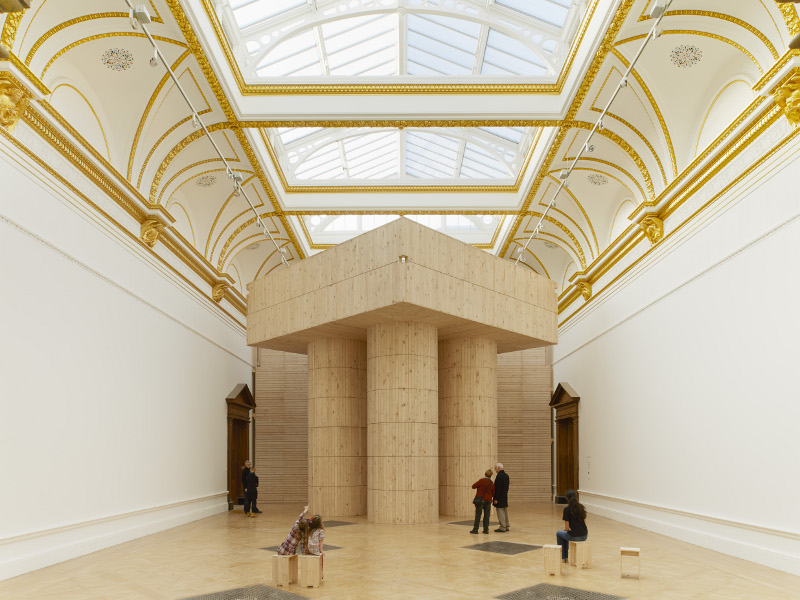Raised high above the gallery floor, at the top of a monumental pinewood structure both futuristic and feudally fortified, you find yourself face-to-face with a gilded angel. The structure in question is 'Blue Pavilion' by the Chilean architecture practice Pezo von Ellrichshausen - the angel is one of many guarding the Beaux Art 18th century interiors of the Royal Academy Main Galleries.