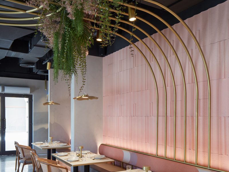 Spatially the restaurant is divided into different sections, and guests are subtly encouraged to move between the different spaces with a design feature of golden pipes curving overhead. As Dean explains: ‘The idea was to visually structure the space and create a delicate yet striking focal point. The gold piping became an obvious choice as it composes a subtle architecture without imposing too much on the space. I like the way the pipes draw arch-like compositions across the walls and through the ceiling as though forming a sheltering, peaceful environment for the guests.’