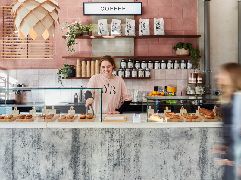 Industrial timber and metal shelving units are designed to display coffee beans, chai tea and handmade gifts, cards and accessories. Retail display space is also used as a key part of the zoning between café and working bakery.