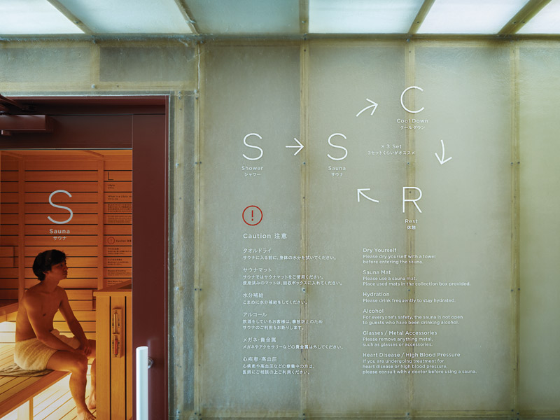 With the introduction of saunas, the hotel seems to move away from the theory that guests only need to ‘shower, sleep and rest’. They see a return to the typical view of a capsule hotel in a contemporary design. ‘The existing building was actually not equipped with saunas, but we intentionally recreated the stereotypical image by adding them, while dispelling the conventional impression,’ says Schemata Architects.
