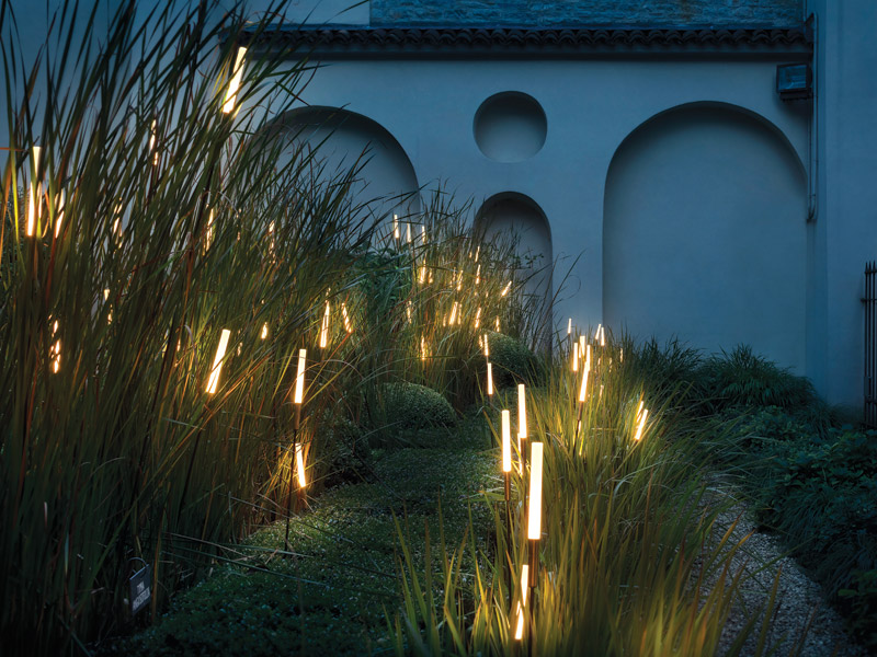 Catellani and Smith has created several organic light fittings for its outdoor collection that blend with a natural environment while adding a sculptural quality, in this case as a cluster. Syphasera features thin brass stems with luminous tops, made of opaline glass. Available in several sizes (from 65cm through to 140cm high), they form a family of customisable light sources, which are available in different versions for the ground, for pots or for water. They have a 5W LED G4 source (2700K, 150lm, CRI 85).