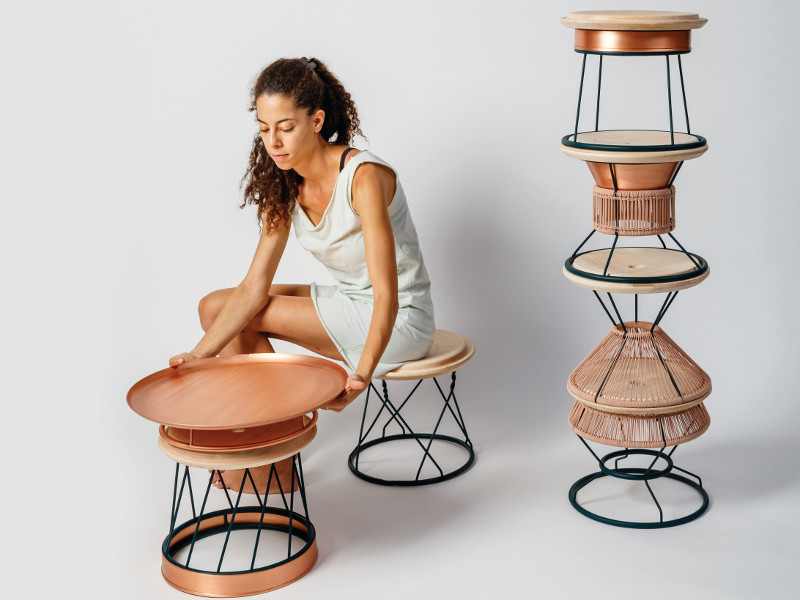 Yemenite Totem (main image): Taking inspiration from the Jewish Yemenite culture, this distinctive design brings together tradition and modern functionality. The Yemenite Totem is a stackable seating set of four stools, made of processed maple wood, and a brass tray – elements that can be stacked on top of one another, fully or partially, as a modular design. The stools feature an iron frame as well as rods in different sizes. The rubber threads are embroidered and woven into the frame. Various types of materials and artisanal techniques create a play between colours and textures. The Yemenite Totem reflects how past and present ways of living can co-exist, by giving a solution to an everyday need while bringing back old cultural styles.