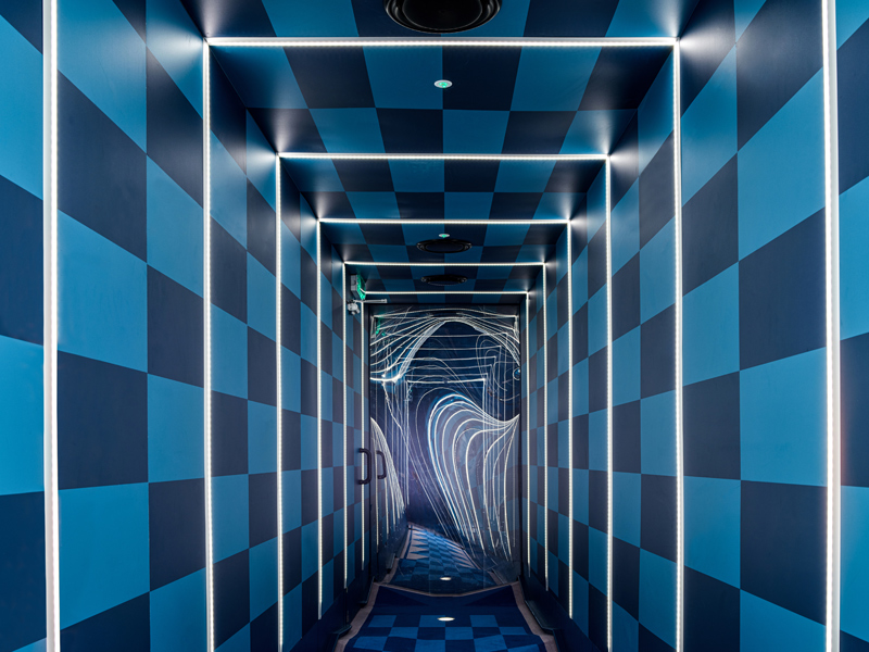 Individual features for each hole were dictated by the theme. These include Hole 4 – Velocity, which is kitted out in Roy Lichtenstein-style primary colours and black and white graphics, sharply outlining its curved ramp and above-head ‘gravity track’ which, as the ball whizzes overhead out of sight, ‘keeps players very much in suspense’, says Dalziel. Hole 2 features ‘all sorts of obstacles’, according to the website, including a large, melting ice cream and... giant Liquorice Allsorts. Elsewhere, a prism-filled, intense yellow and black space warns ‘Take no Prism’ers’. Look out for fading and sensor-triggered lighting along the way, while the ‘infinity’ hole, with sequential strobe lighting and a one-way mirror, gives the impression of an endless tunnel – apparently a customer favourite, says Dalziel.