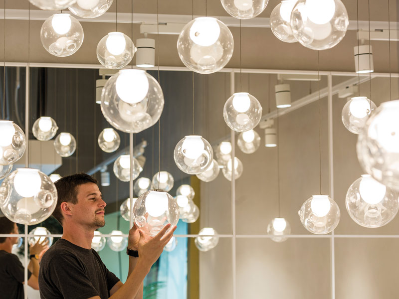 Shining bright: Final adjustments are made by Kiwi & Pom designer Kevin Chote to a composition of pendant lighting, installed within a new Marks and Spencer cafe in Brussels.