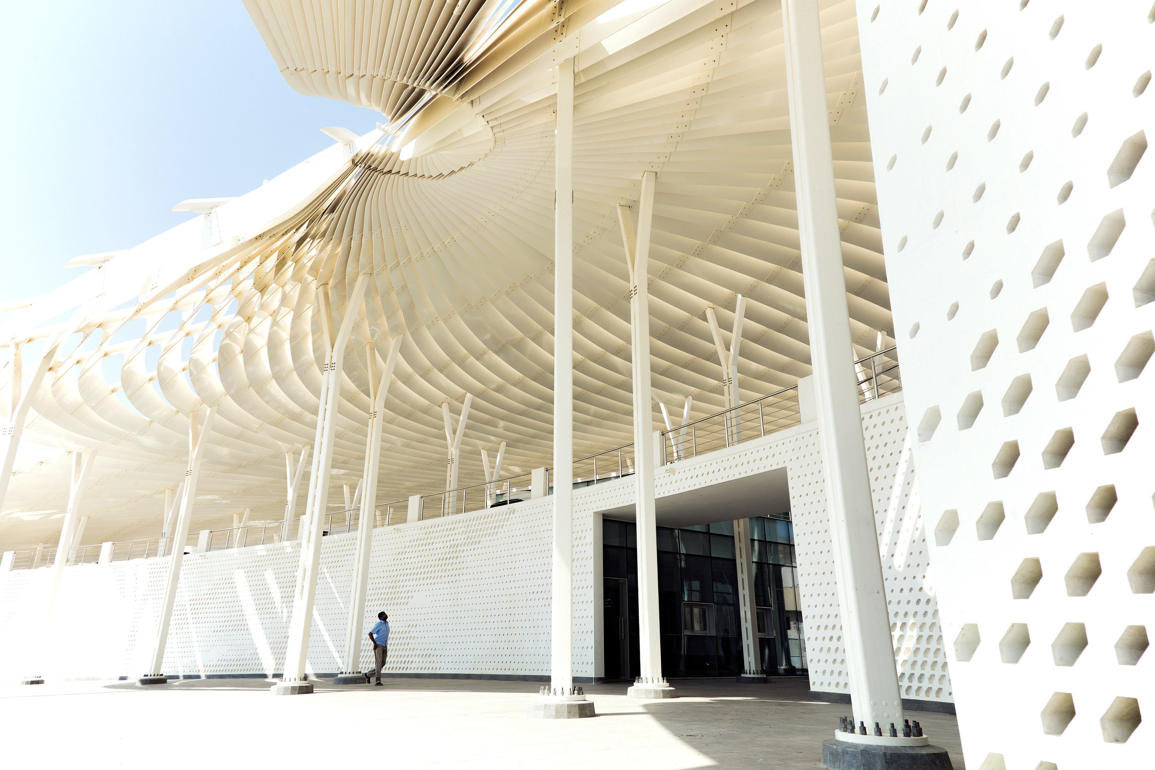From street level, Snøhetta’s design enriches the area by forming a dynamically shaped canopy; the roof’s form has been inspired by the sinuous flow of Arabic calligraphy, in another nod to the traditions of the region. Light and shadow come into play again; the aluminium fins that make up the canopy provide shade while also allowing enough light into the space, as well as creating natural ventilation. The canopy roof’s complexity alongside the simple, solid concrete structure below makes for a stimulating contrast.