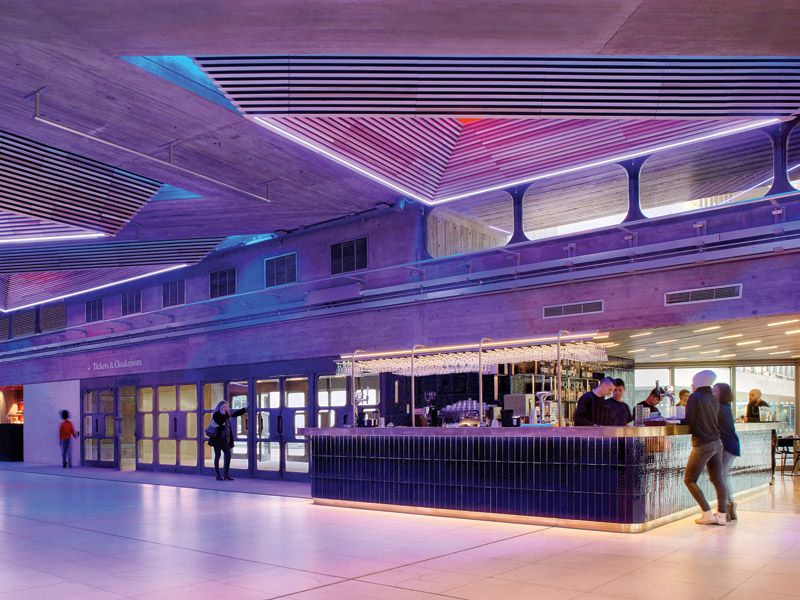Prior to the restoration, the space had previously been used as a lounge area. As inspiration for its concept Archer Humphryes explored popular British art movements of the late 1960s and 1970s together with late expressions of post-war modern architecture. The existing structure and materials were retained, but the new bar/cafe, interval bar and seating areas were given their own language by employing strong colour and innovative surfaces.