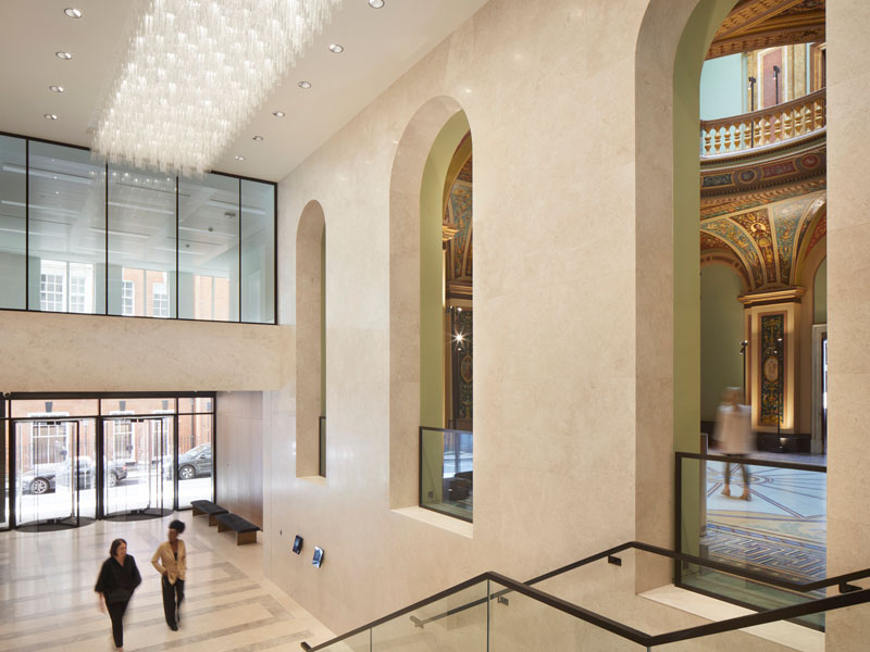Externally, the original heritage entrance on St James’s Street has been restored to enhance the 1840s stonework and custom flags have been installed. Internally, a feature sculpture and planting highlight grand steps that welcome guests into the striking heritage reception at the heart of the building, known as the Saloon. Now reinstated as a key circulation route between the heritage building and the extension, it features contemporary furniture upholstered in bold colours offsetting the intricate heritage frescos, the floor tiling and the original dome on the fourth floor.