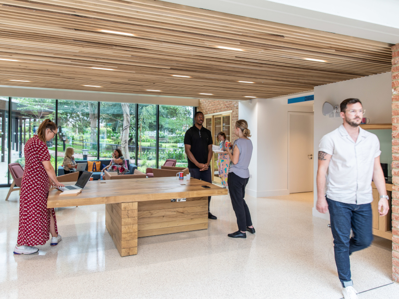 As for the interiors, the landscaped setting is complemented by the natural colour palette that plays across the interior in blocks of colour. Here, there is a combination of the St Christopher’s logo colours of green and blue.