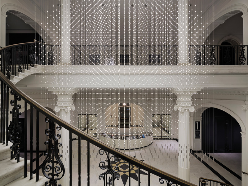 A Site-Specific light sculpture for the Museum of the City of New York, Starlight won a Merit award in the recent IALD International Lighting Design Awards. A massive statement for the imposing elliptical stairway at the heart of the historic interior, the uniform geometry of the spatial grid creates a moiré effect, producing intriguing optical effects according to the viewpoint.