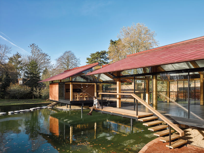 The two adjoining structures seem composed of the simplest elements: diamond-tiled overhanging roofs, perched on a steel base, with timber glulam frame, timber floors, and walls of either sheer glass or brick. But achieving this level of simplicity, and to this standard, has been a massive labour of love and ingenuity for architects Hamish Herford and Nick Lyons, of London and Tewkesbury-based practice Hamish & Lyons. It has been a massive commitment (financially and emotionally) for the client too: a hotelier and his wife, who wanted to expand the bedrooms and play spaces beyond their main house in Berkshire, to give greater vent to the energies of their five boisterous sons. ‘They wanted to get the kids away from their iPads and into nature,’ says Herford.