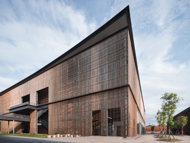 Large bamboo vertical panels are used for the facades of the manufacturing building. Image Credit: RONALD LU & PARTNERS AND ARCH-EXIST