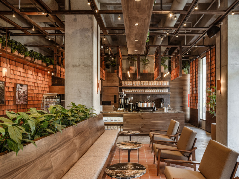 1. Coffee beans as well as coffee colours are at the heart of architecture and design studio Concéntrico’s new store for Kali Coffee Roasters in San Pedro Garza Garcia, Mexico. The design has been created to capture visually the rich heritage of Mexican coffee production, with the rich grain of the walnut wood used at the bar and booths chosen to embody the time taken to grow a coffee crop. The most striking aspect of the design is the natural clay tiles, an idea which developed after the designers visited the coffee growing areas and saw the traditional homes of the plantation workers, with earth walls and handmade tiles. Concéntrico incorporated these rustic tiles into the design, not only to convey that traditional way of life, but to offer a unique and warm texture that will function as an ambiance trademark for the brand. In addition, the curved tiles help absorb and deflect sound waves to improve the acoustics, and, when the light catches them right, the curved shadows resemble coffee beans.