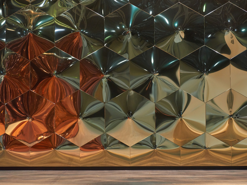 Barrisol has been used in high-profile projects such as the London Aquatics Centre by Zaha Hadid, the Ferrari Museum by Future Systems and the Louis Vuitton shop in Bond Street, London. At Interieur the visitor is met by a vision of golden hexagons on the outside of the imposing pavilion - 7m tall and 12m deep. These honeycomb tiles are covered in a mirrored material. By contrast the interior is all white and, as Lovegrove points out, rather space-like. The wall surfaces are pinched in and out and stretched to the interior framework.