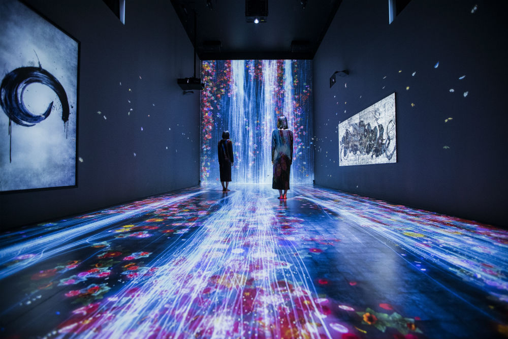 The first and largest room of the exhibition includes six works and features Universe of Water Particles, Transcending Boundaries, a virtual waterfall that extends beyond the gallery wall onto the floor, flowing through the exhibition space and around the feet of the viewer. It engages visitors with the concept of Ultra Subjective Space, which is central to teamLab’s practice.