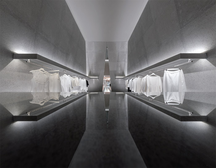 Exploring the relationship between body and space, Various Associates have created church-like architecture for the SND store; the layout is simple, featuring a symbolic ‘milestone’ on the central axis which represents the starting point for the brand becoming international. The site’s narrow and linear characteristics were taken into consideration to the new design, as was SND’s functional requirements; this has resulted in clear, circular routes through the space.
