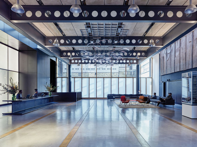 The building is now 82 per cent let, and proving popular with its current occupiers such as luxury fashion retail platform Farfetch. They have used the space in what AHMM describes as an ‘ideal manner’, with ‘very successful’ interior design by Studio Fibre. Keen to remain in The Bower as their business expands, Farfetch wished to take more of the warehouse building, but as the other floors were already occupied, this provided an opportunity for AHMM and Helical to convince Farfetch to take space in the front building by showing the design thinking and potential common to both buildings. Convinced, Farfetch have decided to take three of the interlocking floors, uniting them further by planning a two-storey staircase on one side of the office linking the three levels.