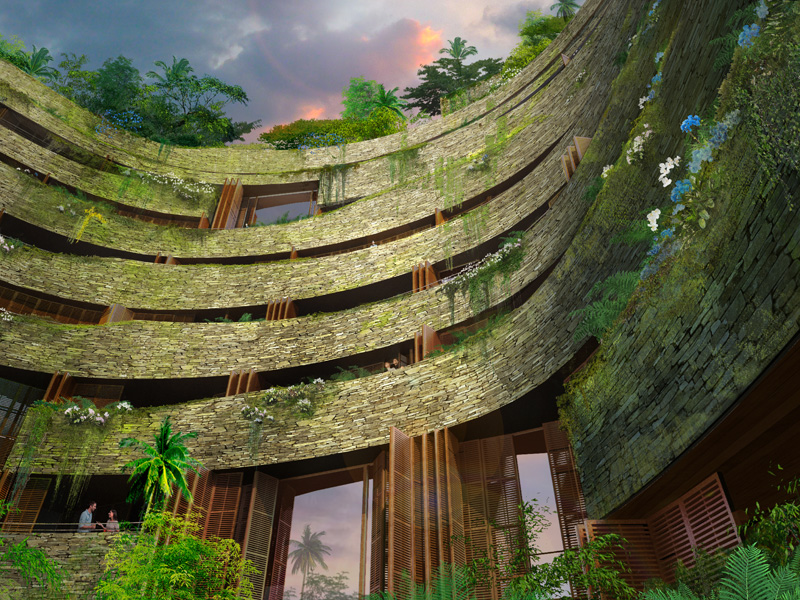 It features a stone facade and more than 1,000m2 of vertical gardens filled with native plants from the region. The complex of towers has an interior courtyard through which its varied amenities are accessed – including an ice skating rink, bowling alley, music room, mini-golf course, screening rooms, mini-soccer field, swimming pool, jacuzzis and spas. Other facilities will be located on semi-private rooftop areas for each tower.