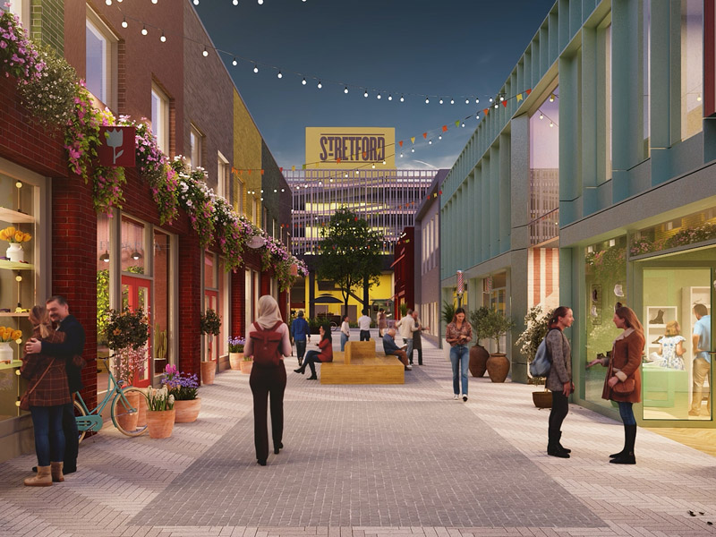 Stretford is to be revived to provide a thriving high street, as well as pedestrianised streets, more greenery and open spaces, and a reconfigured town centre. The development will also create a home for retailers, eateries and bars to boost the local evening economy, spilling out into a new south-facing community space, which will feature a covered shopping area aimed at local independent businesses.