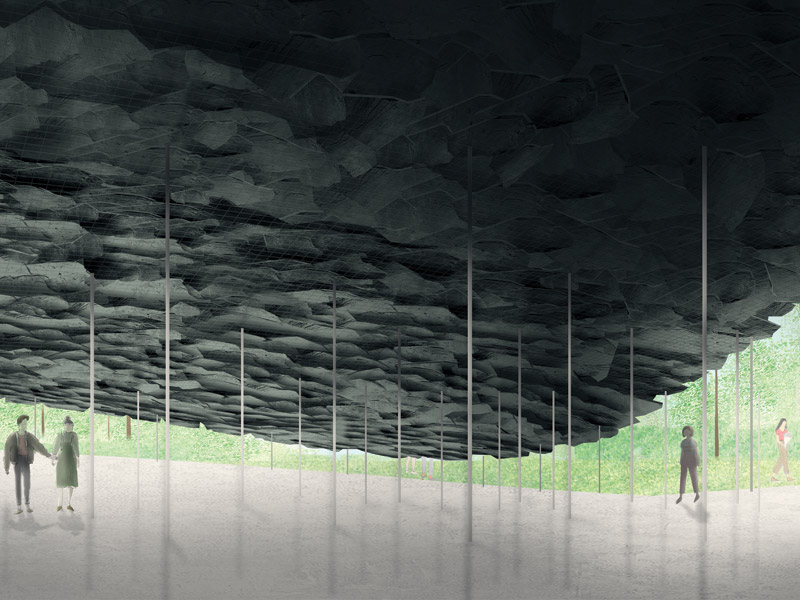 Seeking harmony between architecture and nature, Ishigami’s pavilion focuses on the ‘roof’ – an essential provision for shelter. His surreally lightweightlooking canopy of layered slates emerges from the landscape, offering refuge within. (Less harmoniously, Ishigami has been criticised for using unpaid interns, a practice since banned by the Serpentine for all projects.)