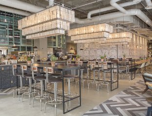The deli and floristry area, which offers breads, cheeses and hams from Borough Market producers as well as a mixology table, features a full-height steel and glass FOCUS screen. This clearly defines this area, with monochrome tiles giving it a sharp, fuss-free appeal, underpinned by the monolithic block of white tiles that forms the display area, around which sits a cluster of bar stools.