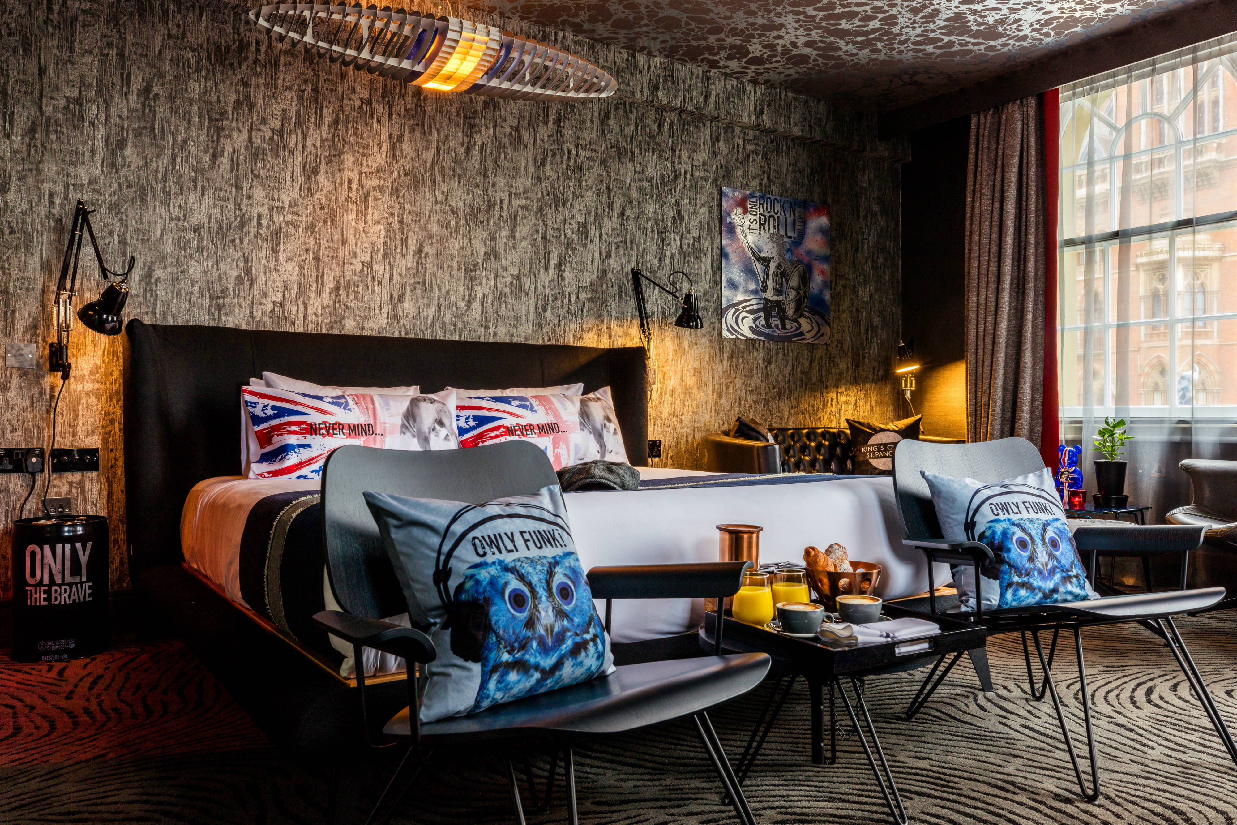 The next stage of the Megaro’s renovation has also now been completed by Chebaane and his team: the makeover of three of the hotel’s prominent corner studios into “rockstar” accommodation. The concept for the suites has been called “Hip Pop Britannia”, and Blue Sky took inspiration for the rooms from the areas surrounding the Megaro, including St Pancras, Kings Cross and Camden.