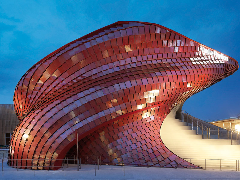 For the USA, James Biber, a former biologist-turned architect, has created a 3, 250 sq m barn of a building with a vertical farm. It is driven by technology. Intended as a space for cultural events, the roof terrace featured 10,000 1m x 3m tiles to create changing patterns of light and shade and carry messages to the world and, being the USA, the architect noted 'messages to God'. He or She is unlikely to need reminding however, as The Great American Foodscape exhibition downstairs revealed that - wait for it - spaghetti and meatballs is a great Italian-American invention.