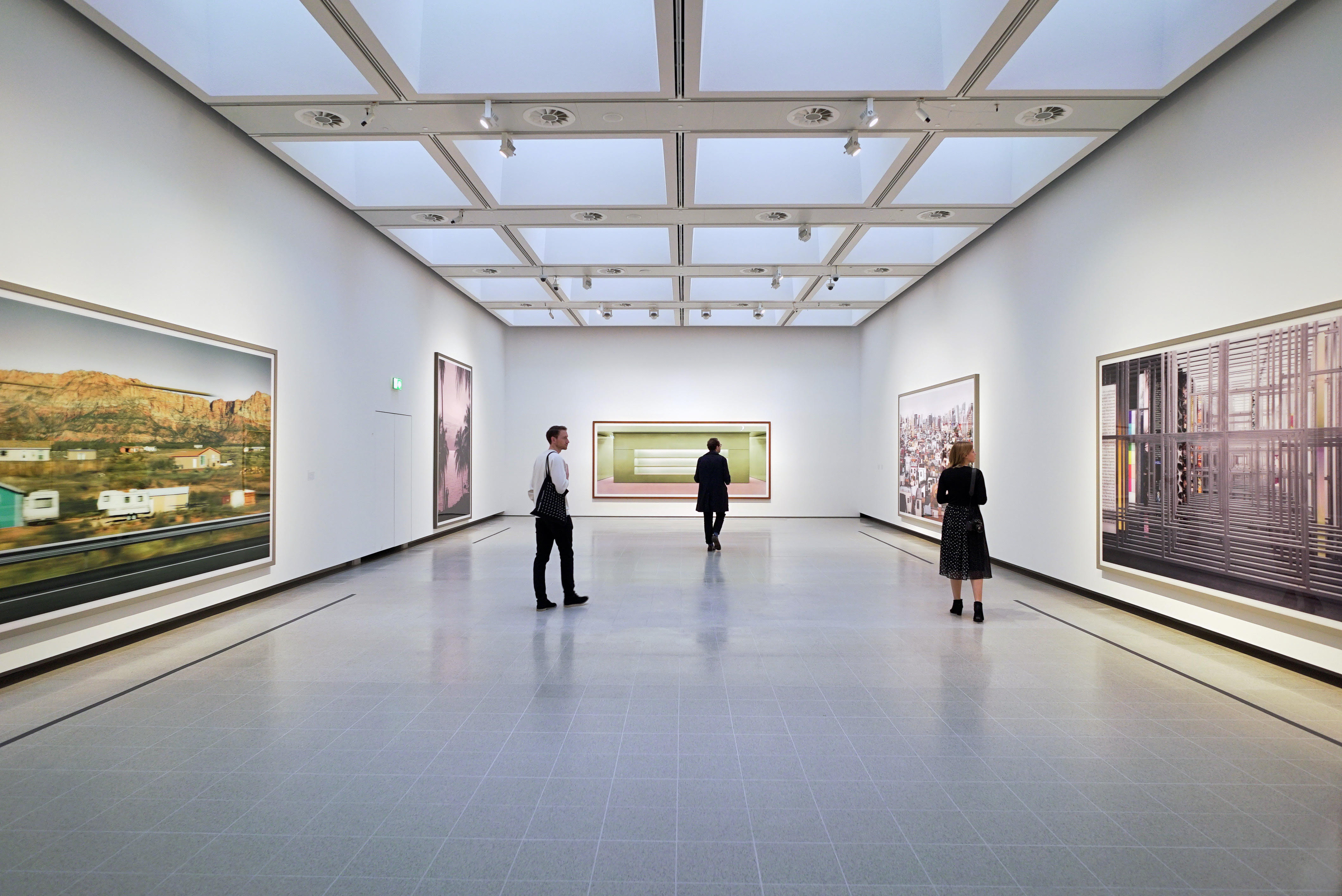 As part of the redesign, a solid glass roof was placed across the main gallery, replacing the dropped false ceiling. Meanwhile, reflective coffers designed to help control the light and direct it into the gallery were fixed on top. Finally, the cleaned and repurposed pyramids were moved, one by one, back on to the roof. Now the pyramids – much like Andreas Gursky’s photographs – provide a window into the outside world. Visitors are able to view the works in different lighting throughout the day, helping bring new perspectives to the photographs.