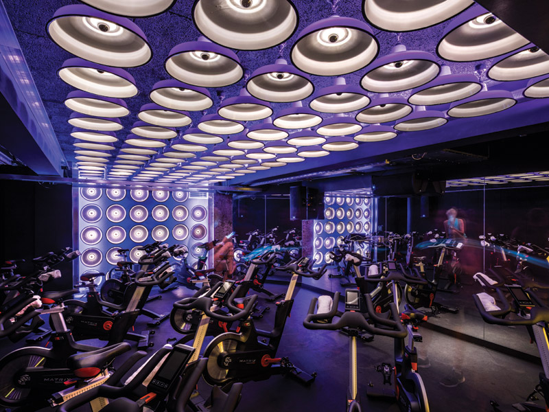 In this room the pendants were backlit with RGB+WW (red, green blue and warm white) LED strip and chrome cap LED sources used instead of the filament lamps so that all the lighting was indirect and had the ability to be dimmed down to the lowest level, another client request. The programming of the lighting system in this room is what sets it apart from most spinning experiences: 45-minute lighting sequences customised to different instructors allow for the room’s environment to change throughout the workout, starting with higher, more invigorating lighting for the warm-up period before suddenly dropping into almost total darkness. At this point the pendants are then reactivated in rows starting from the floor, working up the wall before moving across the ceiling as if building to a crescendo. Colours also change or pulse depending on the stage and intensity of the class, finishing with calm, soft, slowly pulsing lighting for the cool down and stretching.