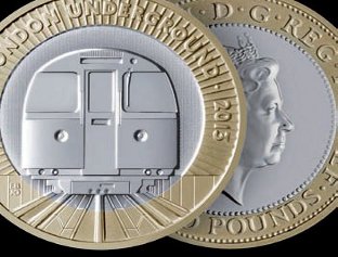 The coin features the London Underground New Johnston font, and the train depicted is a 1967 Victoria line train, chosen for its 'aesthetic simplicity and its wide recognition'.