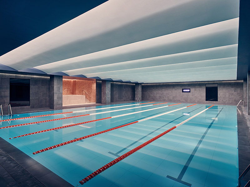 Somewhat unusually, it is designed as a ‘moody, monolithic volume’ – an effect achieved by the dark walls and tinted glass surrounding the pool, which helps to reduce the ‘fish bowl’ effect for those inside it. Yet this deep, dark centre might seem more fitting when you realise the club is actually situated several floors underground. That is if you do realise it – superfast lifts conceal the depth to which you descend and artificial light wells across the space are programmed to change temperature with the time of day. For these, and the lighting across the space, Universal Design Studio worked with lighting designers Illuminationworks.